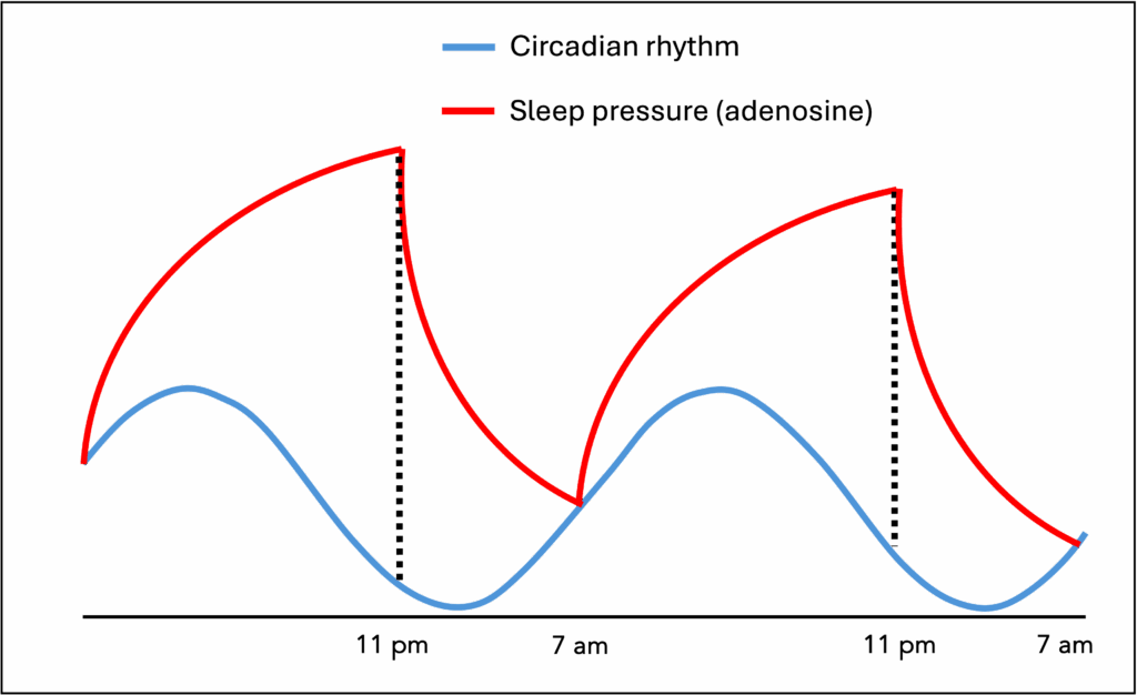 If we imagine these two systems as curves on a graph, the circadian rhythm (blue line), forms a wave that rises and falls throughout the day, while sleep pressure, driven by adenosine (red line), steadily increases from the moment we wake up.
